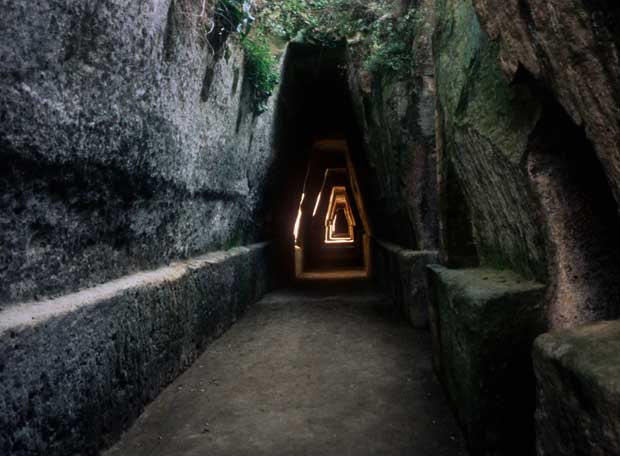 Regreso a Cumas una vez más. Recorro el paseo de entrada y llego al antro que es un largo corredor: estrecho, sostenido por rocas trapezoidales. Por los numerosos huecos que le dan luz se cuelan palomas que revolotean por toda la estancia y son ya las únicas voces audibles. Estoy en el interior mismo del libro VI de la Eneida. Eneas ha llegado a estas costas y sube al peñón "donde preside Apolo / y mora solitaria la Sibila, / augusta en su antro inmenso, ella la intérprete / a quien el delirio vate con su espíritu, / alienta, inspira y muestra lo futuro.